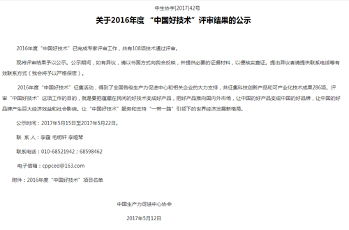 “中國好技術”是為深入貫徹落實黨中央、國務院關于實施創新驅動發展戰略和“大眾創業、萬眾創新”的精神,不斷激發全社會的創新創業活力,營造全民創新的良好氛圍,由中國生產力促進中心協會同國家相關機構和企業共同發起和舉辦的,此獎項評選為每年一次。在2016年度“中國好技術”征集中,得到了全國各級生產力促進中心和相關企業的大力支持,共征集科技創新產品和可產業化技術成果286項,獲得“中國好技術”稱號有108個項目。評審“中國好技術”這項工作的目的,就是要把蘊藏在民間的好技術變成好產品,把好產品推向國內外市場,讓中國的好產品變成中國的好品牌,讓中國的好品牌產生巨大經濟效益和社會影響。讓“中國好技術”服務和支持“一帶一路”引領下的世界經濟發展新格局,讓“中國好技術”走出國門,走向世界。