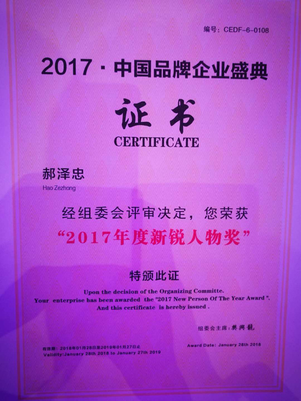 ? ? ? ?在此次盛典上,中科宇杰董事長郝澤忠先生作為一個走在技術創新的前列的大型現代化企業的奠基者和管理者,憑借自己的行業實力,從國內眾多候選企業家中脫穎而出,被組委會授予“2017年度新銳人物獎”。