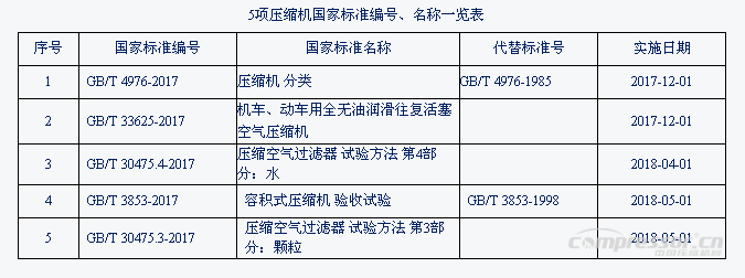 2017年第11號、第23號、第29號中華人民共和國國家標準公告,由國家質(zhì)量監(jiān)督檢驗檢疫總局、國家標準化管理委員會批準發(fā)布了共5項壓縮機國家標準,具體內(nèi)容見表: